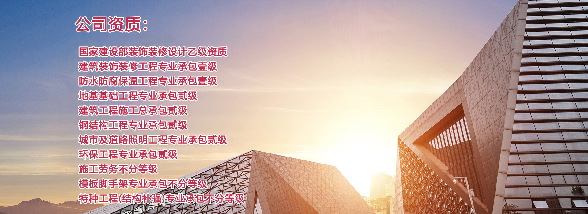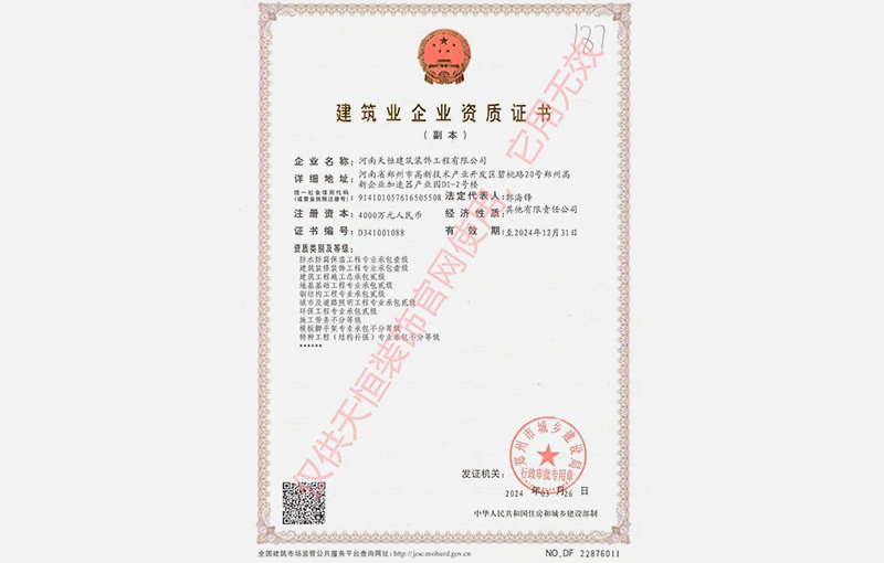 河南天恒建筑裝飾工程有限公司成立于2004年,注冊資金4000萬元,擁有正規的建筑裝飾工程設計專項乙級、建筑裝修裝飾工程專業承包壹級、防水防腐保溫工程專業承包壹級、地基基礎工程專業承包貳級、建筑工程施工總承包貳級、鋼結構工程專業承包貳級、城市及道路照明工程專業承包貳級、環保工程專業承包貳級等多個建筑業企業資質。
